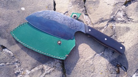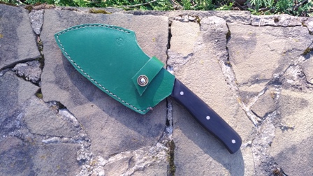 Кухонный и инструмент для рубки и резки мяса с костями, конструкция с накладной рукоятью (фуллтанг). Сталь ШХ15, твердость 58 HRC, кожаный чехол.